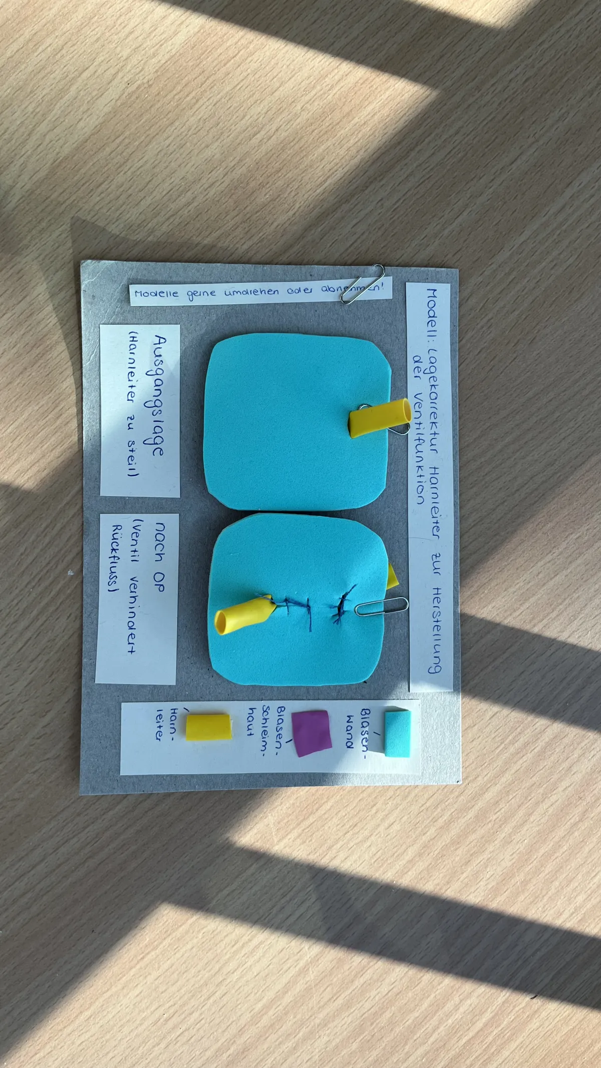 As part of the “Medicine 1” lecture, students constructed models to illustrate either the valve function of the urinary bladder or the corresponding surgical principle. The objective was to design cost-effective, reproducible and hygienically safe teaching tools, either as cut-out models or using easily accessible materials with a detailed construction guide.